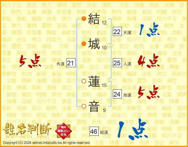 生活面を象徴する運勢です。外部から受ける影響力を表し、結婚運、家庭運や職場、環境への順応性を表します。総運から人運を引いた画数。姓や名が1文字の場合を除く。