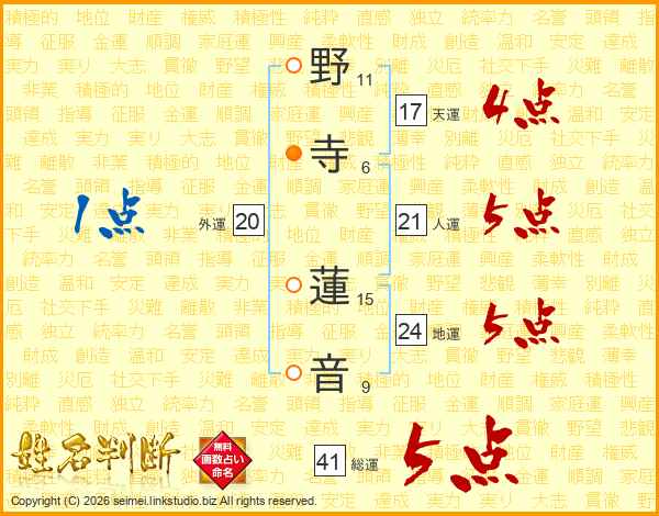 野(11画)寺(6画) 蓮(15画)音(9画)