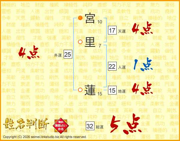 宮里蓮さんの総運は32画の5点!