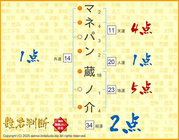 生活面を象徴する運勢です。外部から受ける影響力を表し、結婚運、家庭運や職場、環境への順応性を表します。総運から人運を引いた画数。姓や名が1文字の場合を除く。