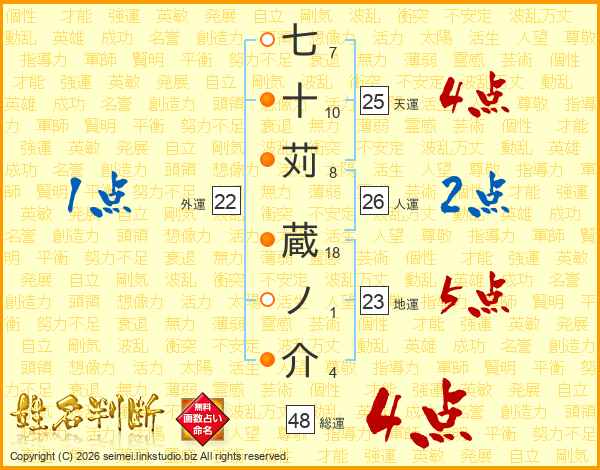 七(7画)十(10画)苅(8画) 蔵(18画)ノ(1画)介(4画)