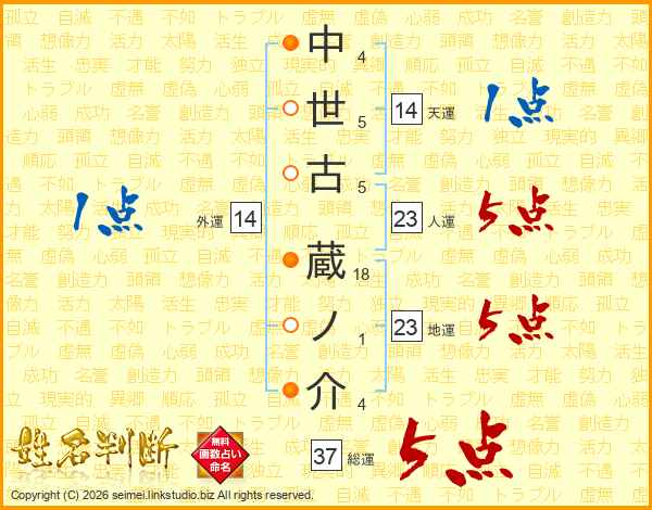 中(4画)世(5画)古(5画) 蔵(18画)ノ(1画)介(4画)