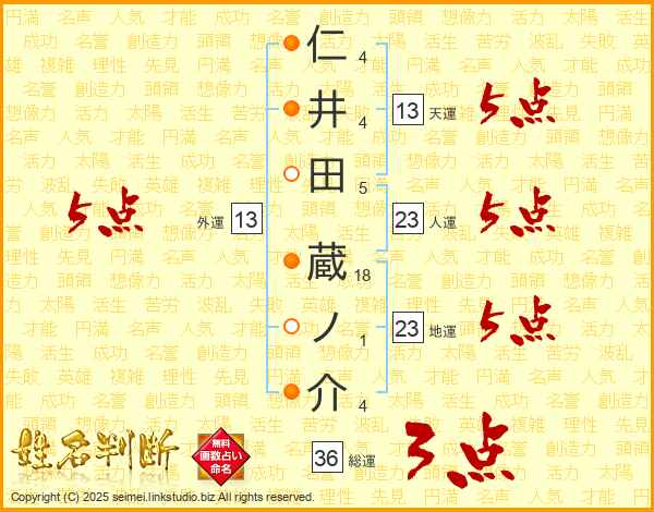 仁(4画)井(4画)田(5画) 蔵(18画)ノ(1画)介(4画)