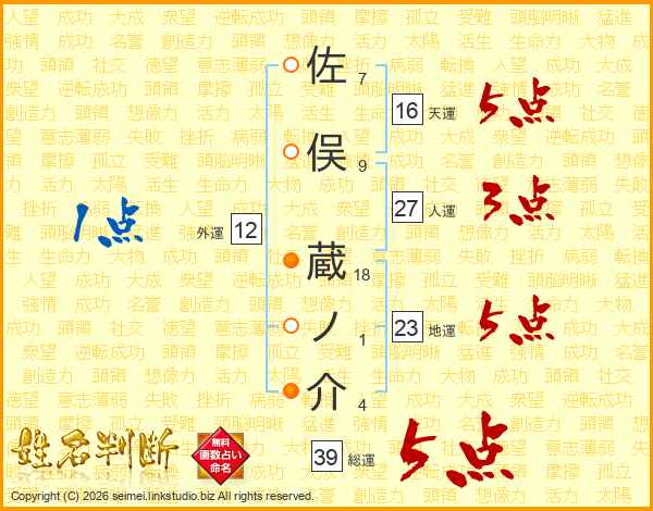 佐俣蔵ノ介さんの総運は39画の5点!