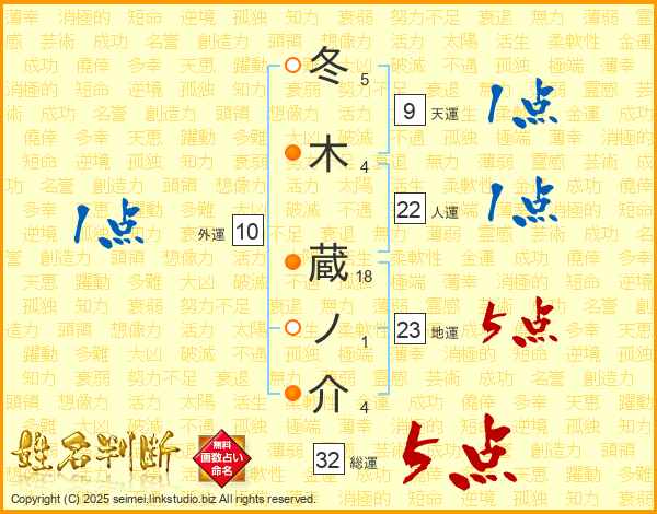 冬(5画)木(4画) 蔵(18画)ノ(1画)介(4画)