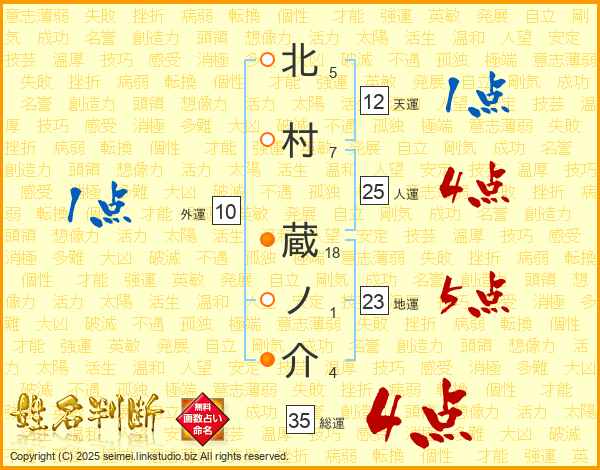 北(5画)村(7画) 蔵(18画)ノ(1画)介(4画)