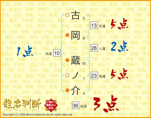 古(5画)岡(8画) 蔵(18画)ノ(1画)介(4画)