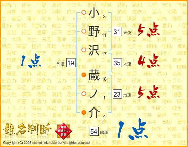 小(3画)野(11画)沢(17画) 蔵(18画)ノ(1画)介(4画)