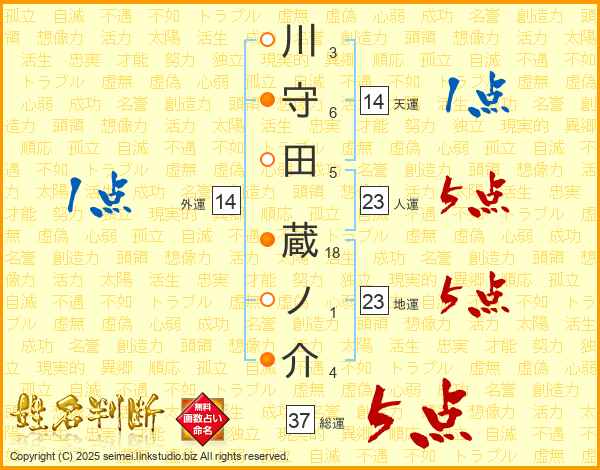川(3画)守(6画)田(5画) 蔵(18画)ノ(1画)介(4画)