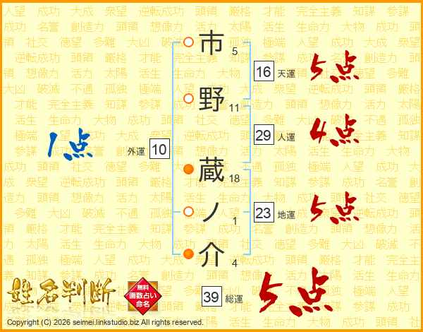 市(5画)野(11画) 蔵(18画)ノ(1画)介(4画)