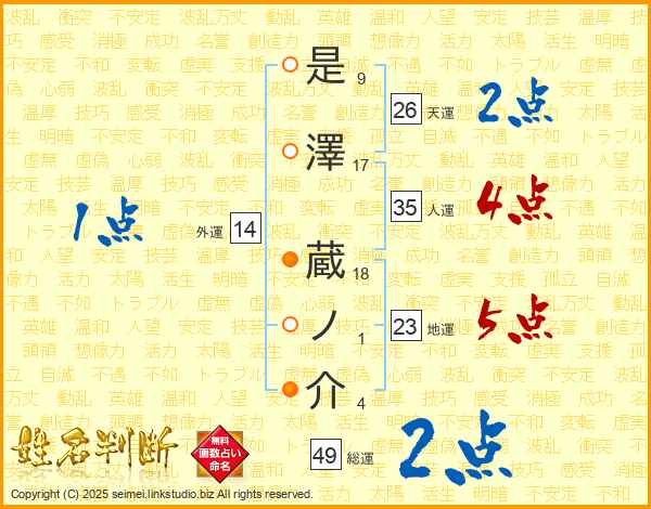 是(9画)澤(17画) 蔵(18画)ノ(1画)介(4画)