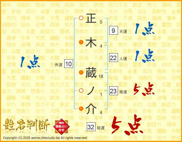 生活面を象徴する運勢です。外部から受ける影響力を表し、結婚運、家庭運や職場、環境への順応性を表します。総運から人運を引いた画数。姓や名が1文字の場合を除く。