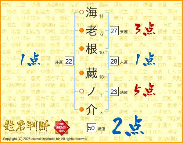 海(11画)老(6画)根(10画) 蔵(18画)ノ(1画)介(4画)