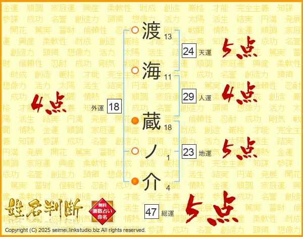 渡(13画)海(11画) 蔵(18画)ノ(1画)介(4画)