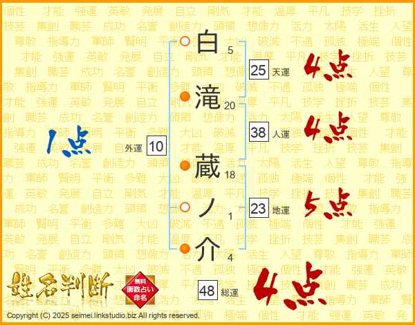 白(5画)滝(20画) 蔵(18画)ノ(1画)介(4画)