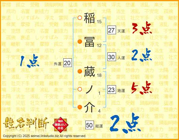 稲(15画)冨(12画) 蔵(18画)ノ(1画)介(4画)