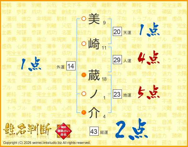 美(9画)崎(11画) 蔵(18画)ノ(1画)介(4画)