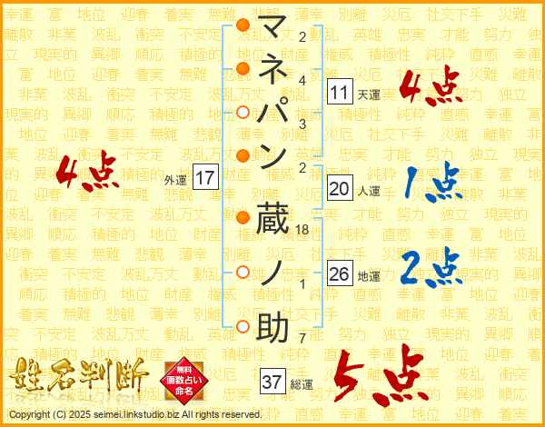 マ(2画)ネ(4画)パ(3画)ン(2画) 蔵(18画)ノ(1画)助(7画)