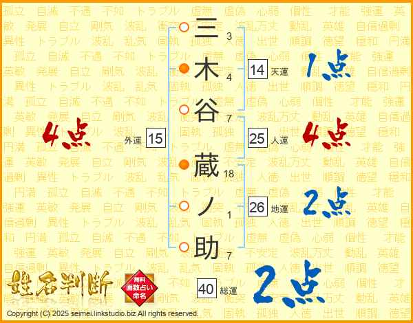 三(3画)木(4画)谷(7画) 蔵(18画)ノ(1画)助(7画)