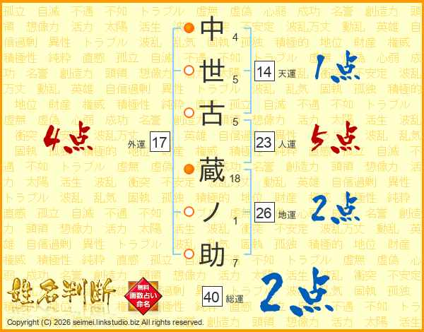 中(4画)世(5画)古(5画) 蔵(18画)ノ(1画)助(7画)