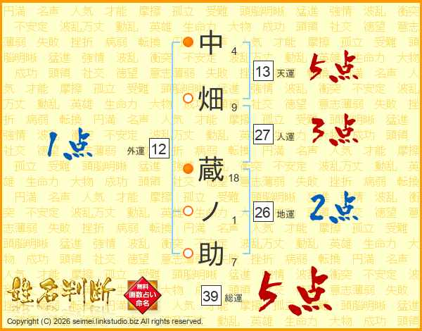 中(4画)畑(9画) 蔵(18画)ノ(1画)助(7画)