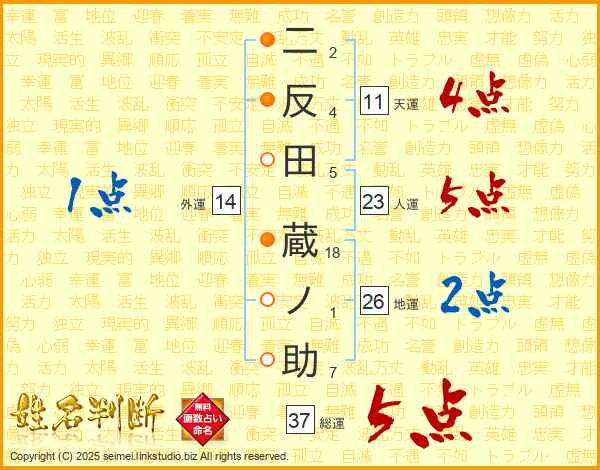 二(2画)反(4画)田(5画) 蔵(18画)ノ(1画)助(7画)