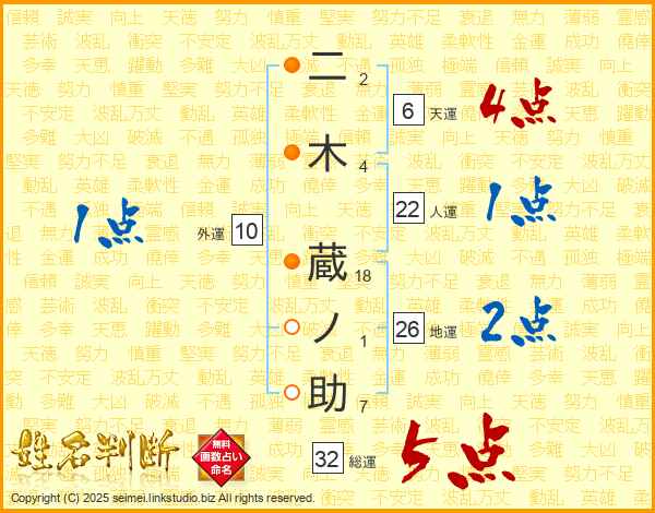 二(2画)木(4画) 蔵(18画)ノ(1画)助(7画)