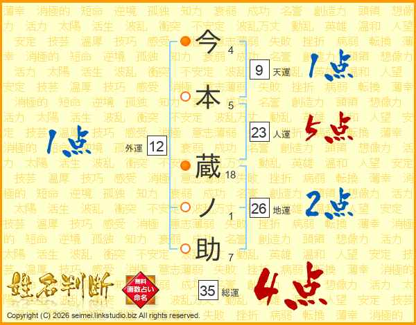 今(4画)本(5画) 蔵(18画)ノ(1画)助(7画)