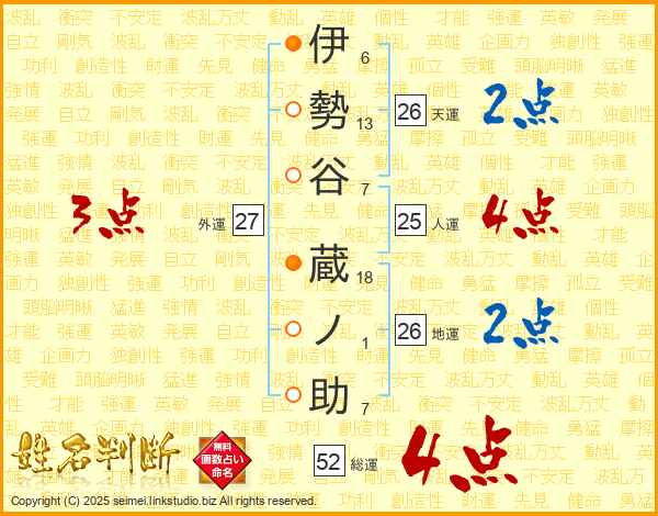 伊勢谷蔵ノ助さんの総運は52画の4点!