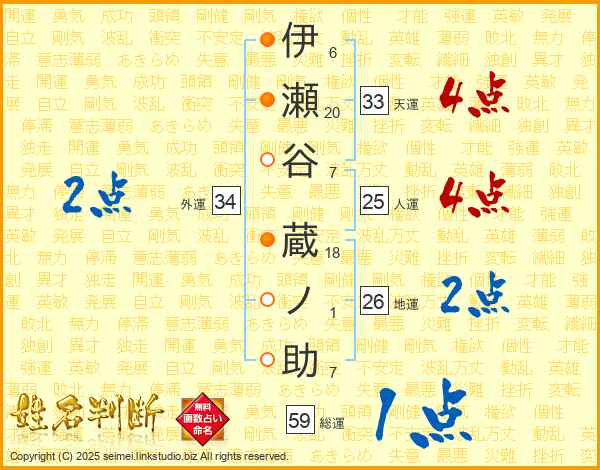 伊瀬谷蔵ノ助さんの総運は59画の1点!