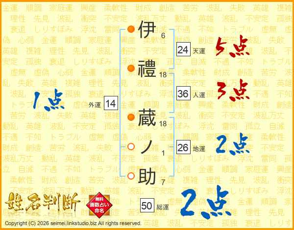 伊(6画)禮(18画) 蔵(18画)ノ(1画)助(7画)