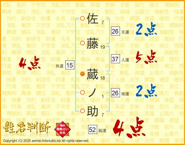 佐(7画)藤(19画) 蔵(18画)ノ(1画)助(7画)