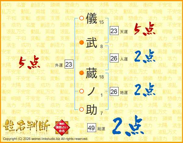 儀(15画)武(8画) 蔵(18画)ノ(1画)助(7画)