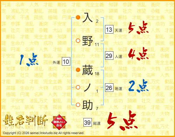 入(2画)野(11画) 蔵(18画)ノ(1画)助(7画)