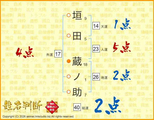 垣(9画)田(5画) 蔵(18画)ノ(1画)助(7画)