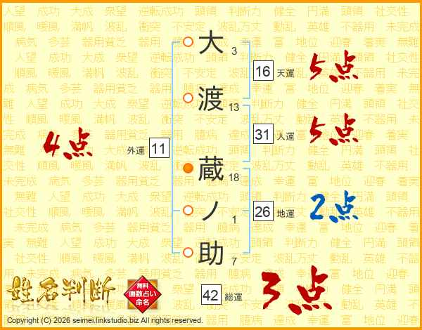 大(3画)渡(13画) 蔵(18画)ノ(1画)助(7画)