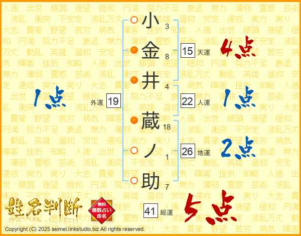 小(3画)金(8画)井(4画) 蔵(18画)ノ(1画)助(7画)