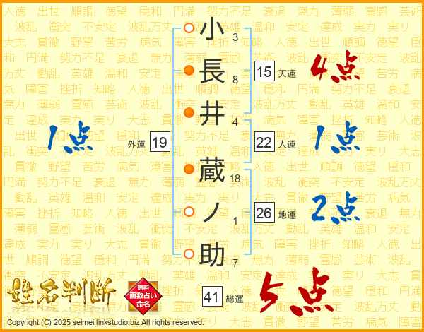 小(3画)長(8画)井(4画) 蔵(18画)ノ(1画)助(7画)