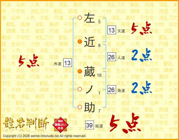 左(5画)近(8画) 蔵(18画)ノ(1画)助(7画)