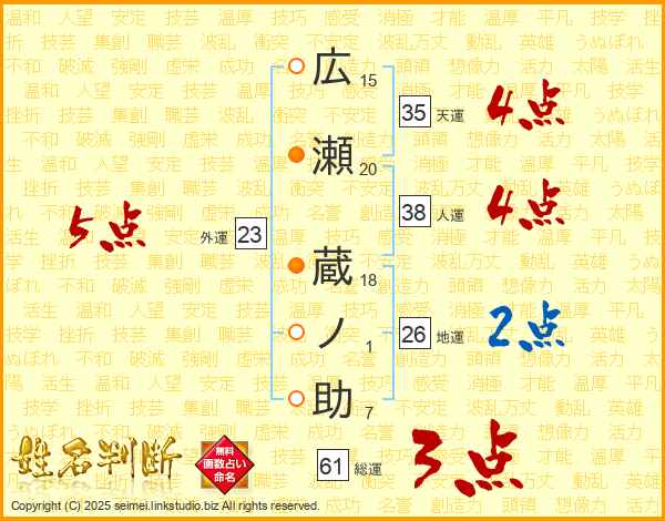 広(15画)瀬(20画) 蔵(18画)ノ(1画)助(7画)
