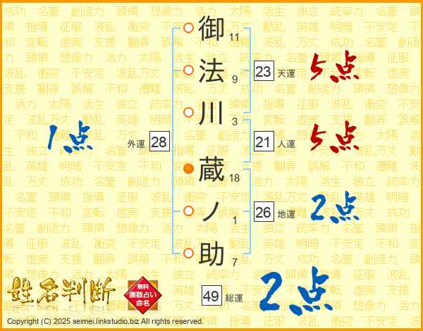 御(11画)法(9画)川(3画) 蔵(18画)ノ(1画)助(7画)
