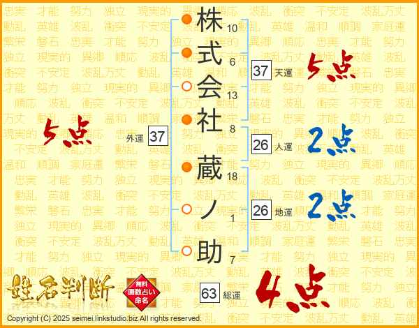 株(10画)式(6画)会(13画)社(8画) 蔵(18画)ノ(1画)助(7画)