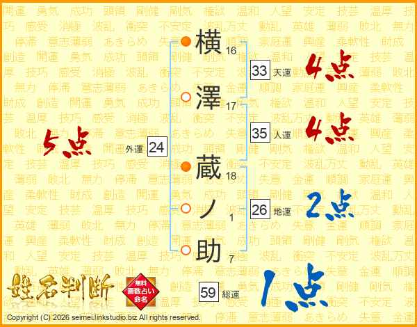 横(16画)澤(17画) 蔵(18画)ノ(1画)助(7画)