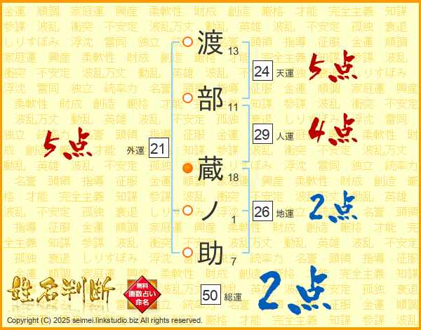 渡(13画)部(11画) 蔵(18画)ノ(1画)助(7画)
