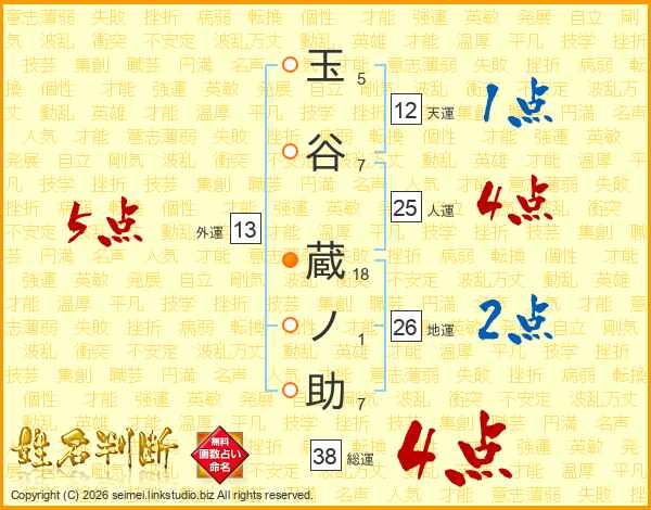 玉(5画)谷(7画) 蔵(18画)ノ(1画)助(7画)