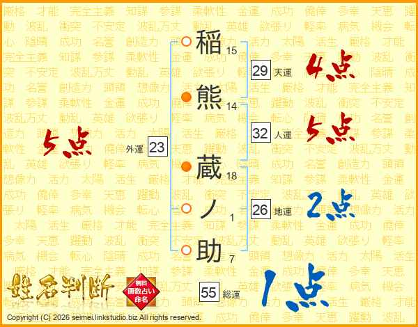 稲(15画)熊(14画) 蔵(18画)ノ(1画)助(7画)