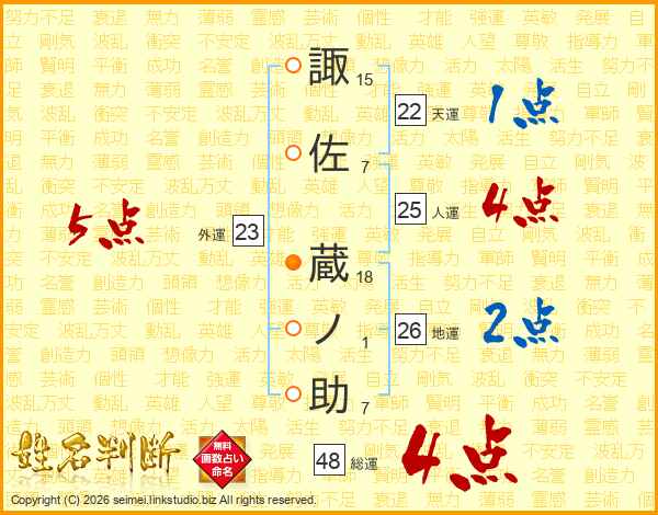 諏(15画)佐(7画) 蔵(18画)ノ(1画)助(7画)