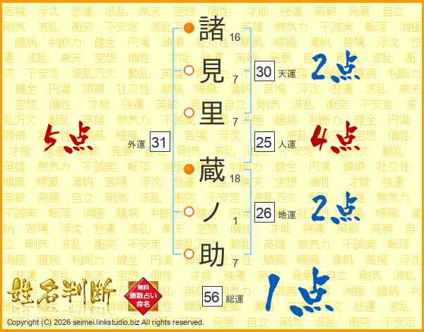 諸(16画)見(7画)里(7画) 蔵(18画)ノ(1画)助(7画)