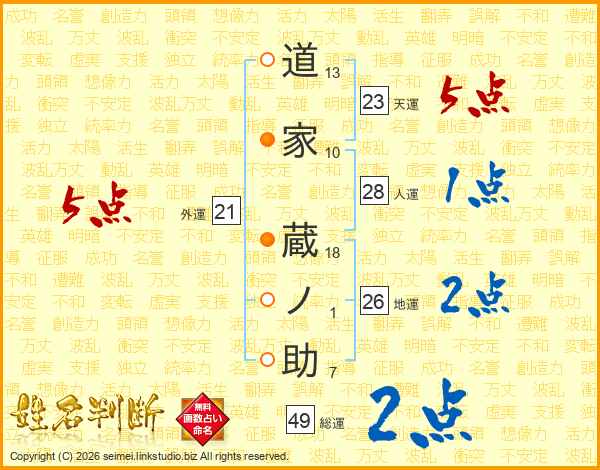 道(13画)家(10画) 蔵(18画)ノ(1画)助(7画)