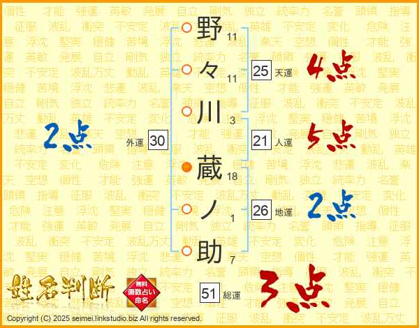 野(11画)々(11画)川(3画) 蔵(18画)ノ(1画)助(7画)